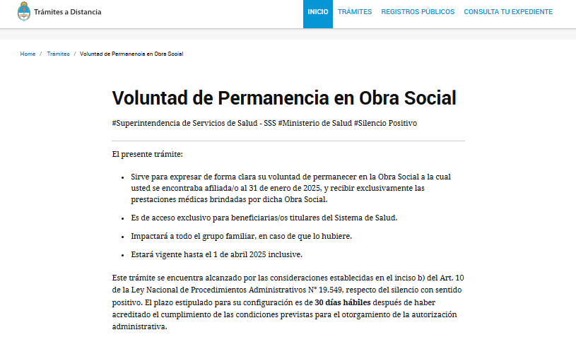 Esta resolución establece que quien desee continuar con la obra social en la cual se encontraba afiliado/a al 31 de enero de 2025 debe realizar una Manifestación de Permanencia en Obra Social ante la Superintendencia de Servicios de Salud. Se trata de un trámite virtual que se realiza a través de la Plataforma de Trámites a Distancia (TAD).